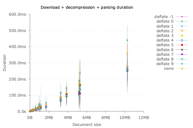 For larger documents, all compression methods have similar performance regarding the time it takes to download and decompress them.
